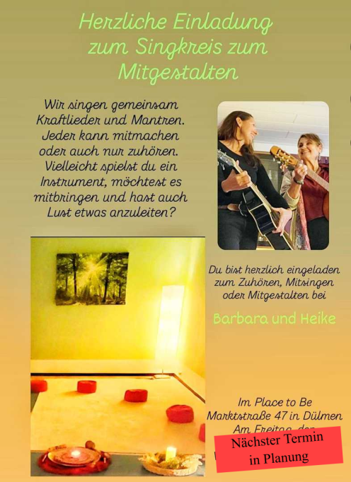 Diesmal haben einige Teilnehmer eigene Instrumente mitgebracht und wer wollte konnte selber Lieder vorschlagen und auch anleiten. Mit einem Harmonium, einer schamanischen Trommel und zwei Gitarren haben wir die Lieder klangvoll begleiten können. Es hat allen Teilnehmern, auch denen die noch keine Erfahrungen im Singen oder Kraftlieder Singen hatten, sehr gut gefallen und gut getan. Am Ende sind alle sehr beseelt und beschwingt nach hause gegangen und entspannt ins Wochenende gestartet. Der Wunsch war das zu wiederholen und dem kommen Heike und ich gerne nach. Wir freuen uns schon auf unser nächstes klangvolles Treffen und halten Euch auf dem Laufenden.